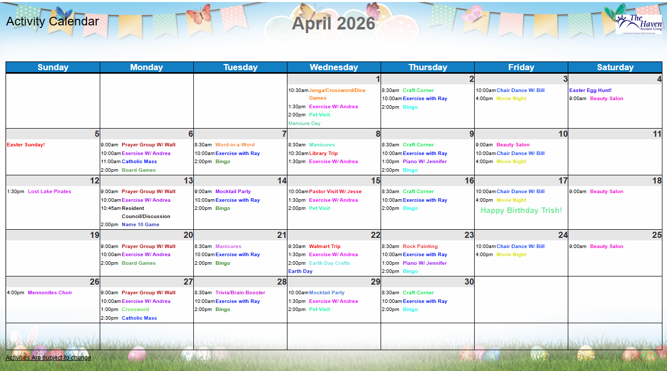 “Everyone at The Haven loves and cares for mom and all their residents! The staff is outstanding and the residents are awesome! The Haven has become a big part of our family now and we couldn’t be happier.”